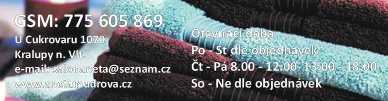 Vítejte na stránkách nově otevřeného KOSMETICKÉHO SALONU ANETA, plného vůní a slastného odpočinku.„Vaše vizáž je Vaší vizitkou. Za každého mluví zdravá a krásná pokožka.“